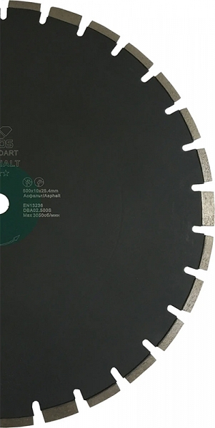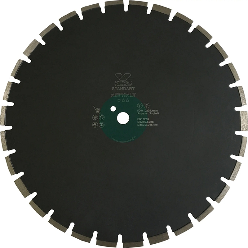 Диск алмазный сегментный по асфальту Keos Standart Asphalt 500 мм (Кеос Стандарт Асфальт 500 мм) предназначен для резки асфальта и асфальтобетона на бензиновых, дизельных и электрических резчиках и швонарезчиках мощностью до 12 кВт.