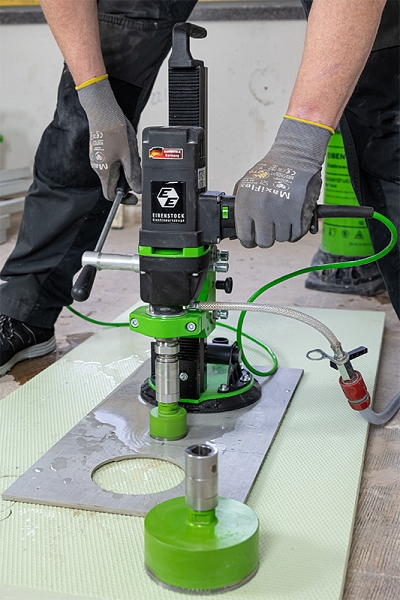 Станок для мокрого алмазного сверления плитки Eibenstock EFB 125 P Set (Айбеншток ЕФБ 125 П Сет) с вакуумным основанием предназначен для точного мокрого сверления отверстий Ø 6 – 125 мм в плитке и плитах из керамики, стекла и натурального камня для подключения смесителей и унитазов, встраиваемых светильников, выключателей и т. д.